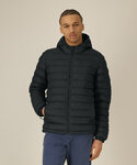 Men’s padded jacket. Medium fit. Set-in sleeve. High collar with a grown-on hood. Adjustable hood opening and bottom hem with plastic stopper and elastic cord. Reverse nylon zip at centre front. Zipped welt pockets with extra grosgrain puller. Fully quilted. Side panels for a better shape. Self-fabric elasticated cuff. Inside seams with binding finish.